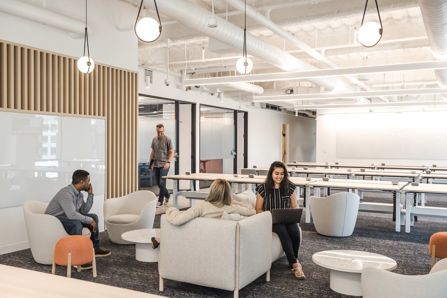 This 38,525 design-build MEP tenant improvement project delivers a modern, open office work environment in an occupied building in a congested downtown location. Amenities include multiple break/lounge areas, kitchen, private phone rooms and huddle spaces, conference rooms, and focus cave. High-end finishes, including specialty acoustic treatments, are highlighted throughout the space.
